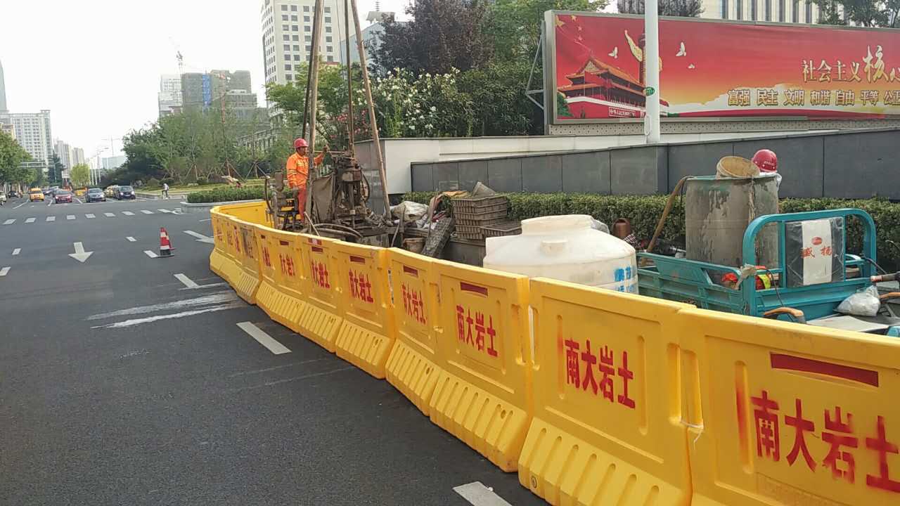 2017年5月中旬,隨著身著南大巖土字樣工作服的技術及施工人員在漢中門大街與江東路交叉口進行施工圍擋,標志著南京地鐵九號線D9-XK02標地質勘察初勘施工正式啟動。本標段南起漢中門大街,沿江東路向北至定淮門大街止,分為三站三區間,全長約2.8km,初勘計劃工期2個月。